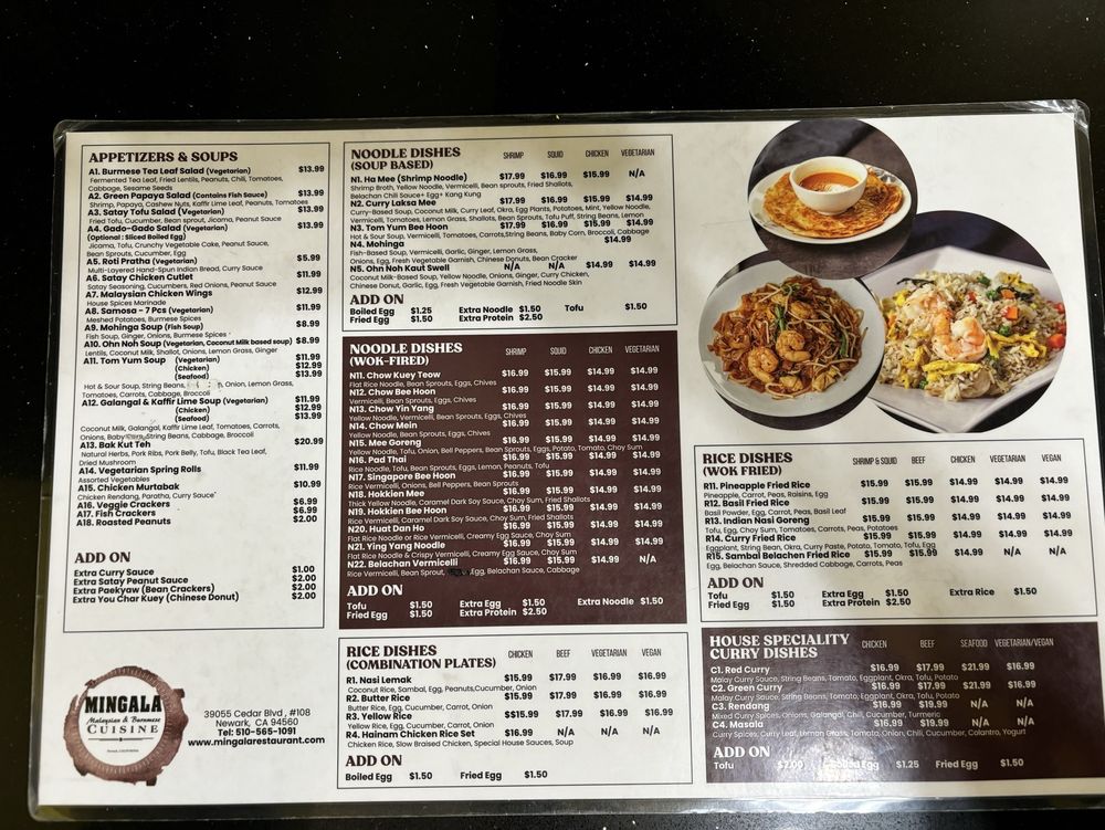 Welcome to Mingala Restaurant, where comfort food meets vibrant flavors! Nestled in Newark, California, this American gem offers a delightful breakfast and brunch experience with a unique twist. The menu boasts a tantalizing selection of appetizers and salads, including the Burmese Tea Leaf Salad—a savory blend of fermented tea leaves, lentils, and crispy peanuts, all for $14.94. For something refreshing, try the Green Papaya Salad, enhanced with shrimp and aromatic herbs.